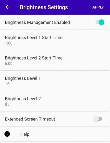 Brightness Settings give you access to RBM’s Screen Brightness Management feature, which lets you set display brightness levels for day mode and night mode, and indicate when the mobile device should switch between these modes. This reduces heat generation from the display and conserves the battery. Like with Battery Modulation and Ethernet, you must make sure the Brightness Management Enabled toggle switch is on before you can access the other brightness settings below.