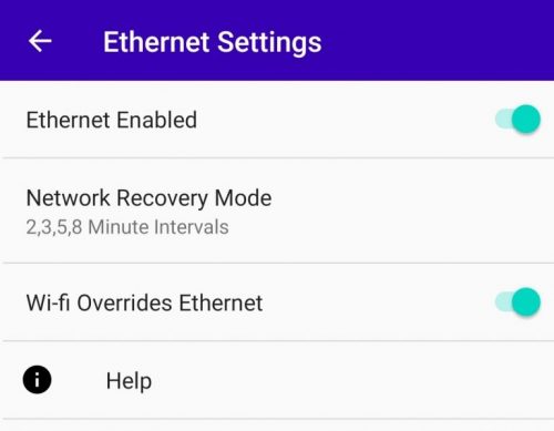 In Ethernet Settings, you can turn Ethernet on or off, determine whether Wi-Fi should override the Ethernet connect, and set the Network Recovery intervals.