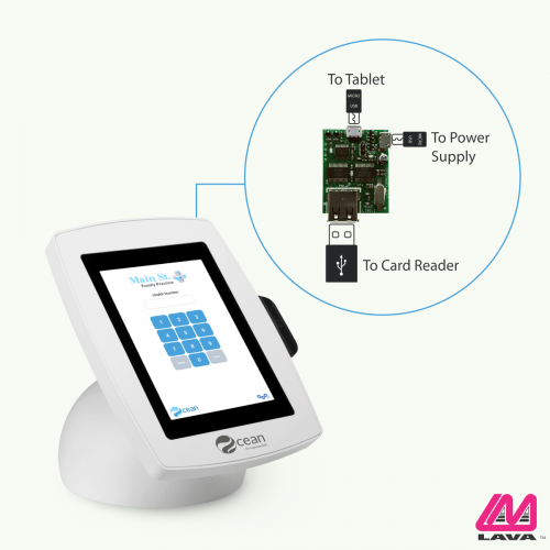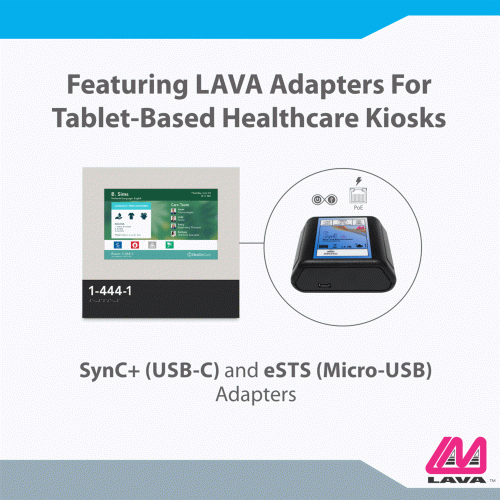 Tablet-based kiosks provide a fast and efficient way for patients to check into a hospital or clinic, which is safer for all involved by reducing in-person contact. Ocean by Cognisant MD developed a patient kiosk that integrates a LAVA eSTS-1U-OEM adapter, which provides simultaneous charging and access to data.