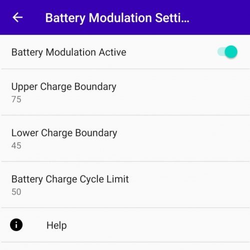 First, make sure the Battery Modulation Active toggle switch is turned on. Otherwise, you won’t be able to access anything else in the menu. You can set the Upper Charge Boundary and Lower Charge Boundary in percentages (between 20% and 100%). This will indicate to the adapter when the mobile device should stop and start charging. You can also set a Battery Charge Cycle Limit, which allows the user to set how many modulation cycles the battery will go through before it fully charges to 100%. You can choose between 4 and 9,999 cycles.