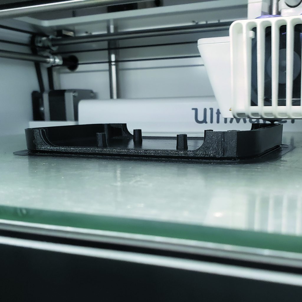 Before the Ultimaker S5 3D printer receives the GCODE files and starts printing, the desired filament(s) must be loaded into the printer. As individual components are completed, our engineers analyze them to determine if any further design revisions are necessary. LAVA primarily uses PLA filament during prototyping since it is widely accessible, inexpensive, and easy to print with. ABS filament is also used in many final prototypes due to its material properties that allow it to withstand high temperature and UV effects in outdoor settings.
