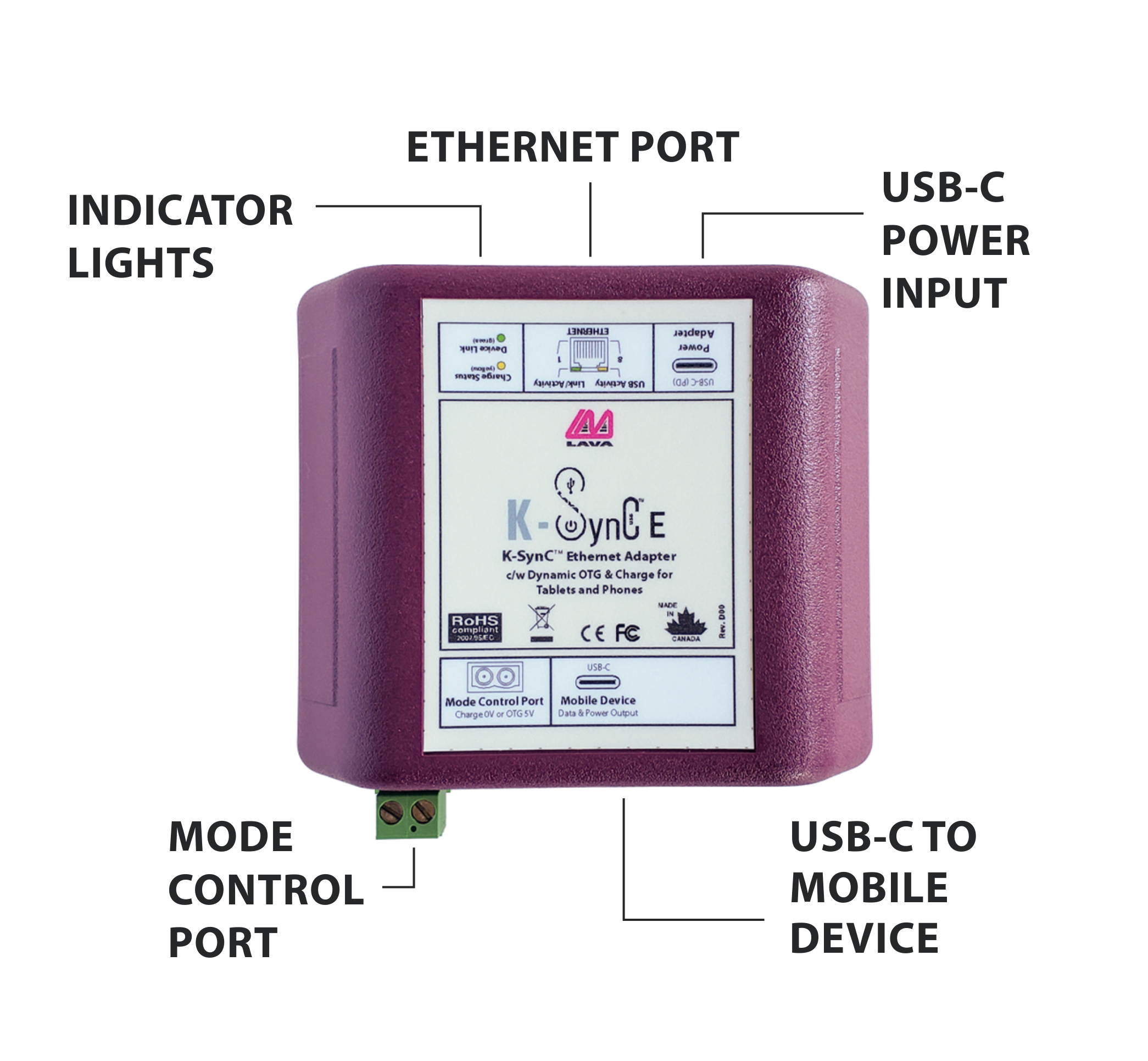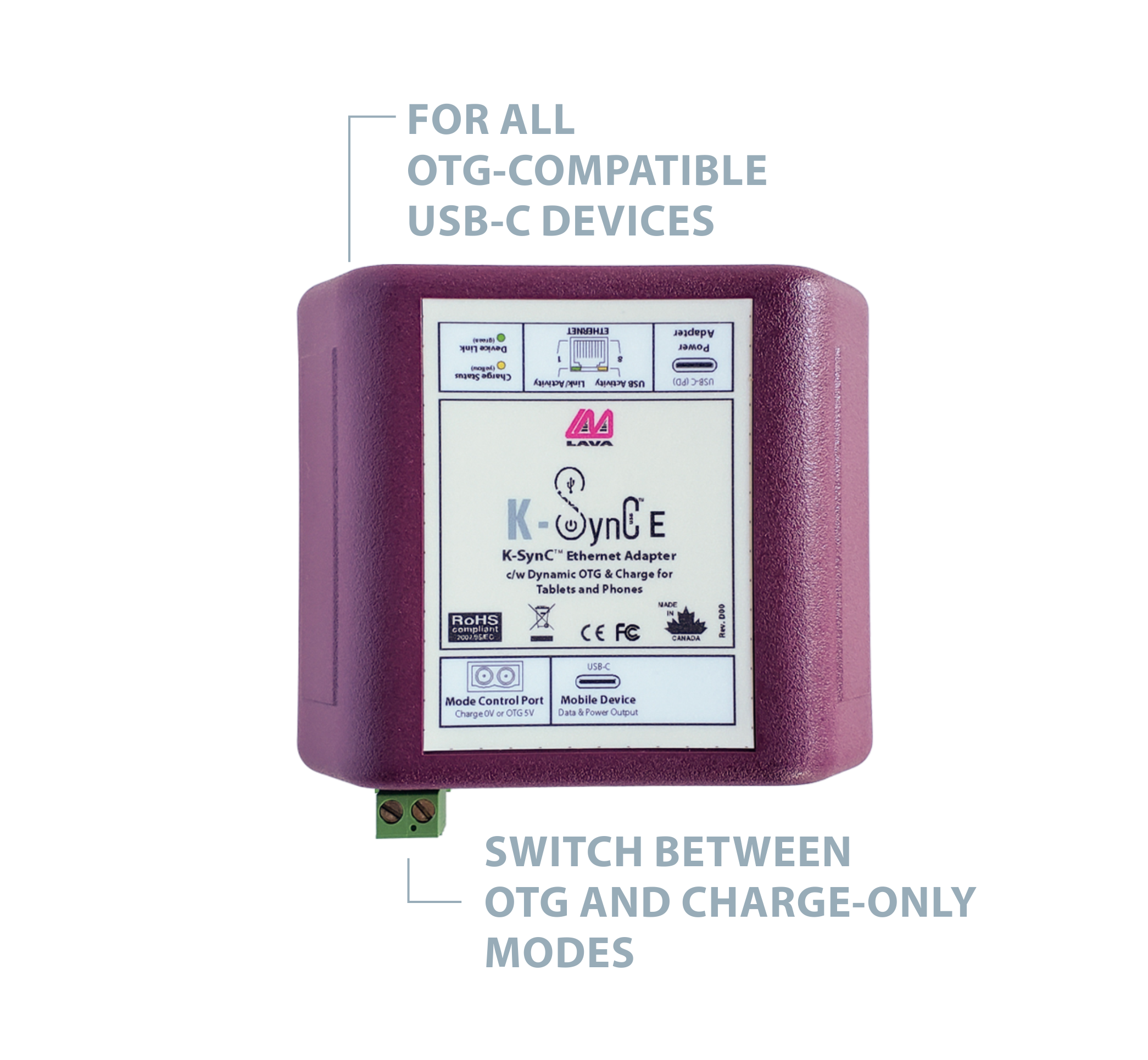 A tablet power adapter that also offers OTG mode, the K-SynC-E is designed to let you to switch between operational modes. In OTG mode, the adapter uses the tablet's internal battery to power peripherals. Alternatively, in charge-only mode, the tablet receives power directly through the adapter. This product features an Ethernet port for a wired network connection, though other port configurations are available.