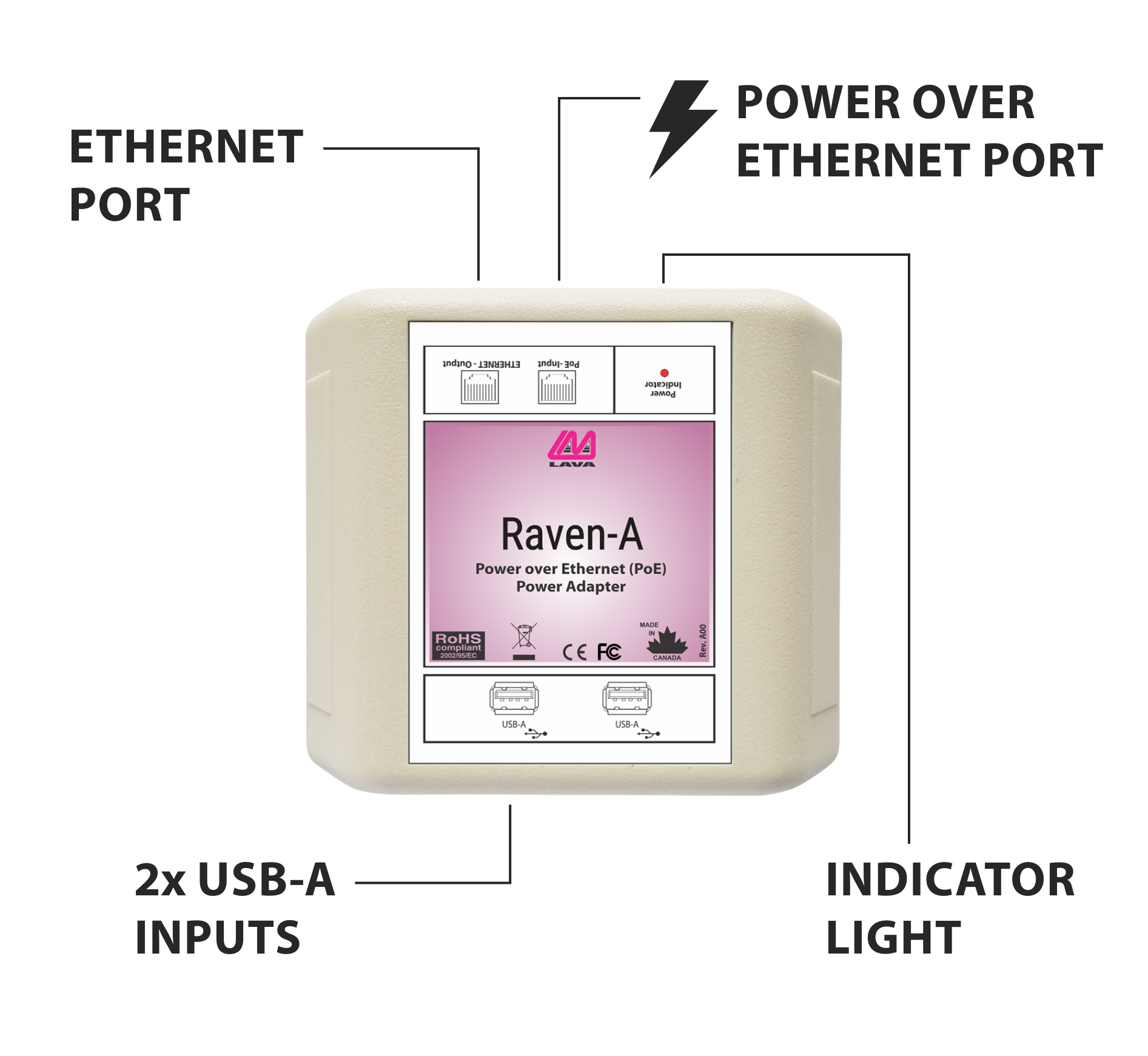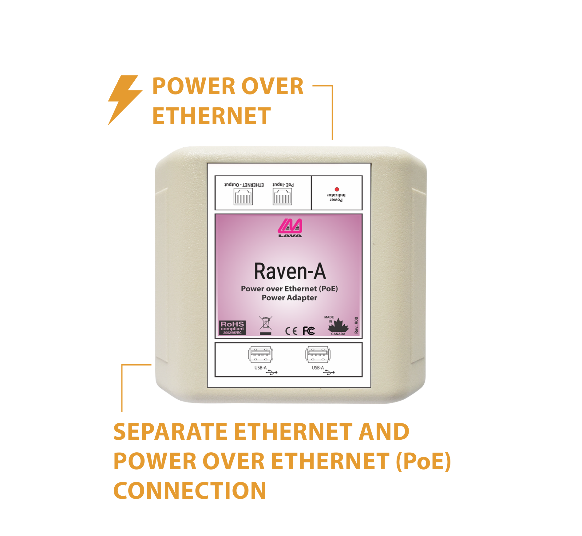 A PoE splitter, the Raven-A takes in Power over Ethernet and splits it into separate power and Ethernet lines. It features two USB-A ports for charging mobile devices and one Ethernet port for a network connection. Providing flexibility of distance, a PoE adapter may be installed up 328ft (100m) from the power source. Moreover, because there is no need for dedicated AC cable routing it does not require the help of an electrician.