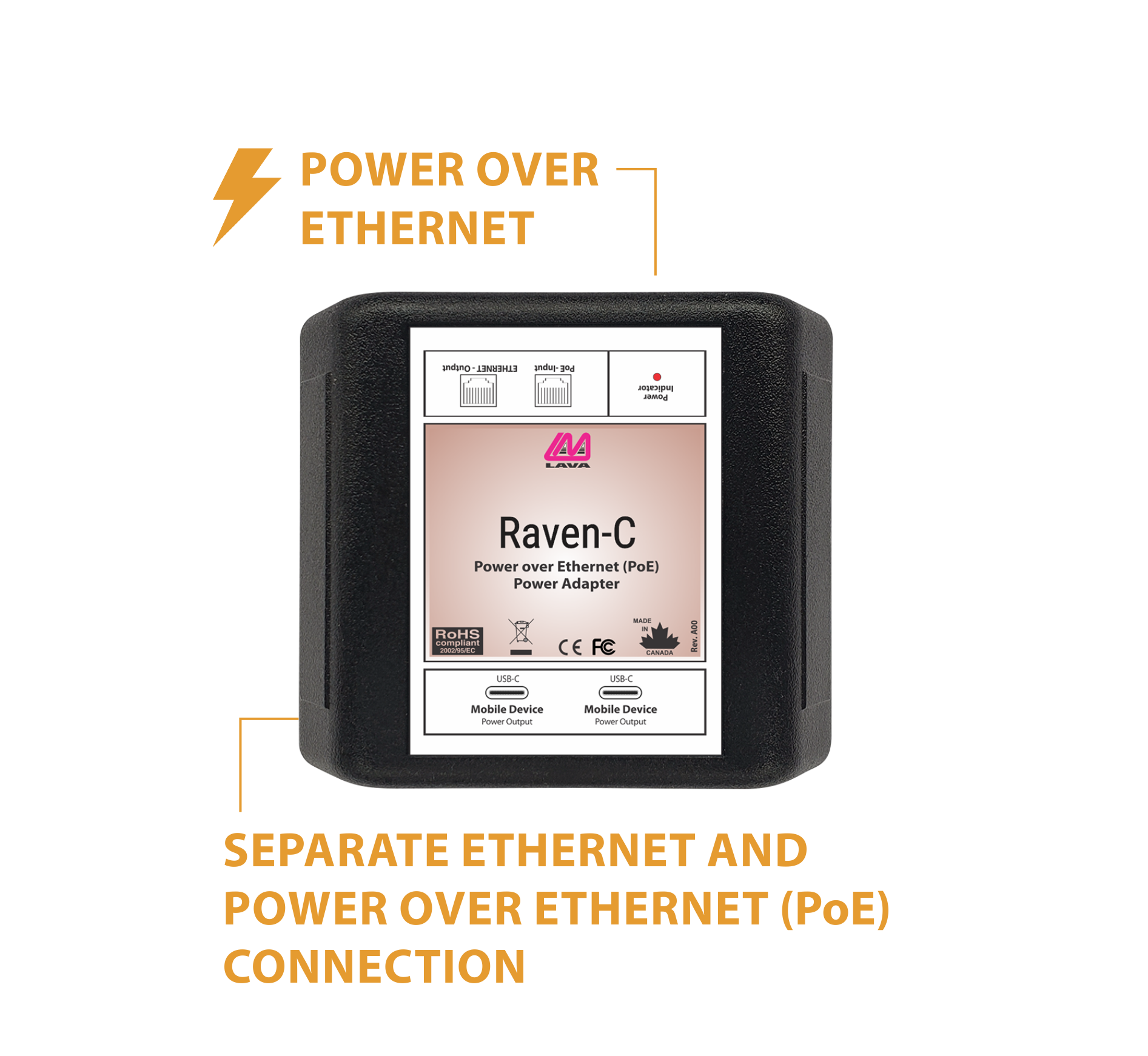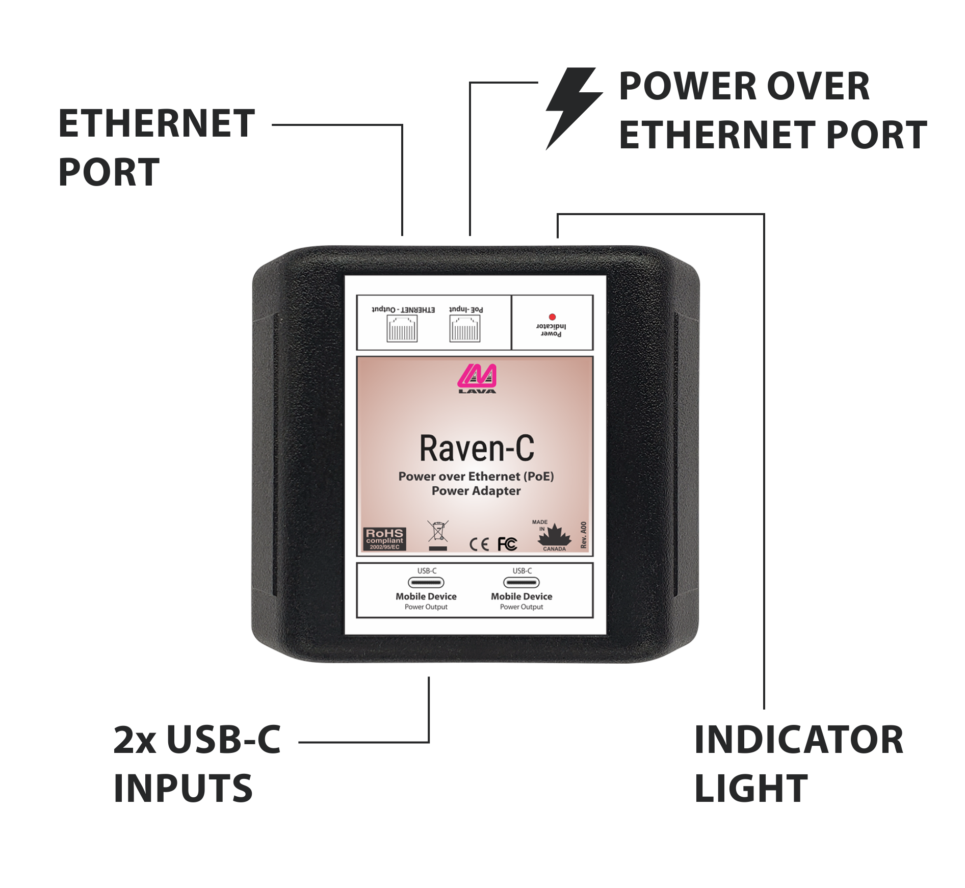 A PoE splitter, the Raven-C takes in Power over Ethernet and splits into power and Ethernet. It features two USB-C ports for mobile device charging and one Ethernet port for a wired network connection. The adapter can be placed up to 328ft (100m) away from the power source. What's more, without the need for AC cable routing, it can be installed without an electrician. This adapter is capable of both standard (5-volt) and fast (9-volt) charging.