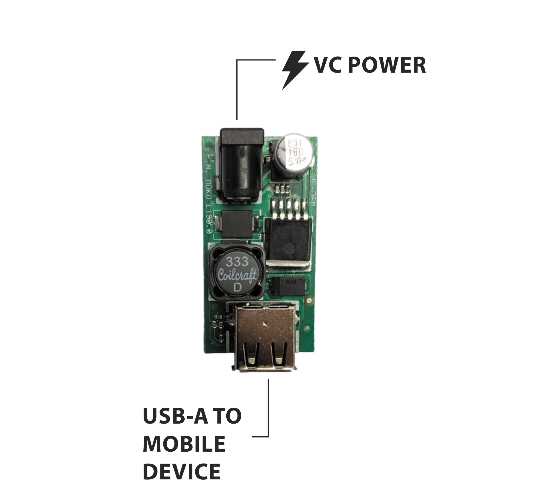 A power-only voltage converter, the VC-OEM is a compact, board-only adapter featuring one USB-A port. Perfect for automotive applications, it takes in 9-36 volts of DC power and converts it to a device-friendly 5 volts. Ideal for supplying power at a distance, the adapter may be installed up to 50ft (15m) away from the power source. Moreover, eliminating the need for dedicated cable routing, it means you won't incur the added expense of an electrician.