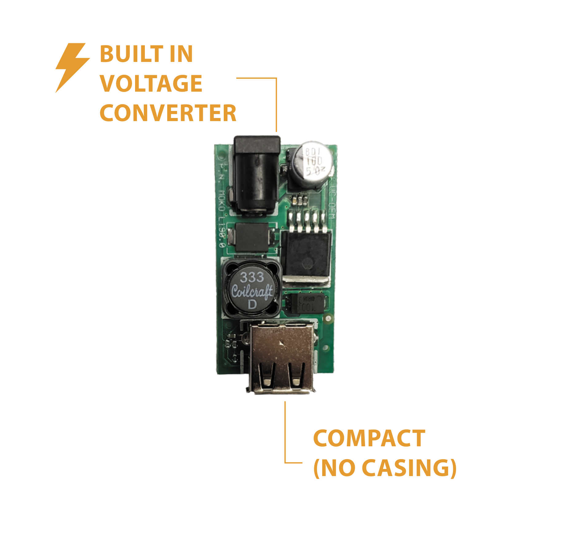 - Includes DC-DC voltage converter and 1x USB-A port (for powering mobile device)